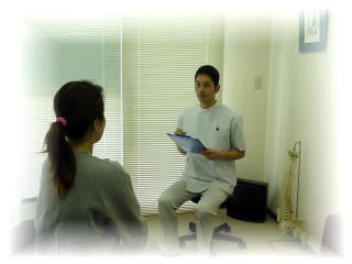 | はじめて受診される患者さんには、痛みや不調についてその発生時期、経過、現在の状態から生活環境について問診が行われます。こうしたカウンセリングを通して、気持ちを合わせ「協力して健康を取り戻す」という意識を確認してもらいます。 |