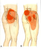 この状態を筋膜性疼痛症候群(MPS)といい、痛みやシビレの原因となります。Kさんの場合も、徒手検査と状況の聴き取りによって筋膜性疼痛症候群(MPS)ではないかと推測できます。触診すると中殿筋、小殿筋に顕著な圧痛ポイントと筋硬結がみられ、関連痛の現れるポイントも一致します。 中殿筋 ![]() 「筋骨格系の触診マニュアル」から